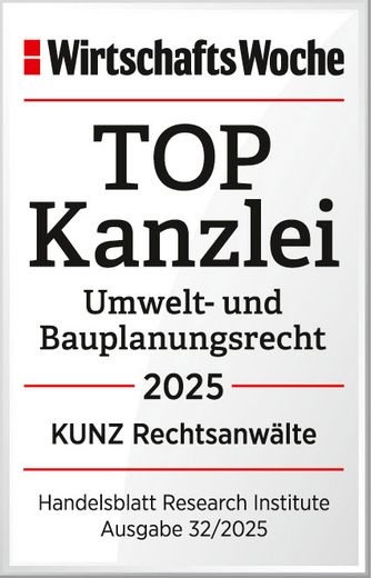 In our "Environment, Climate & Energy" competence team, we combine legal know-how with profound and practice-oriented industry knowledge for the successful structuring and realization of sustainability projects. In the current ranking of WirtschaftsWoche, we are listed as a "TOP Law Firm Environmental and Construction Planning Law 2020"; with KUNZ Partner Dr. Ditandy, KUNZ also the award of an individual as a "TOP Lawyer Environmental and Construction Planning Law 2020".