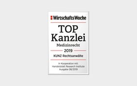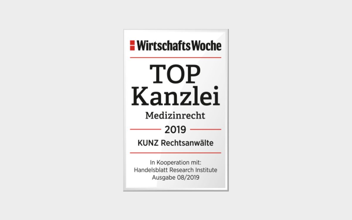 In the current WirtschaftsWoche "Medical Law" ranking, Kunz was awarded the title "TOP Law Firm for Medical Law 2019".